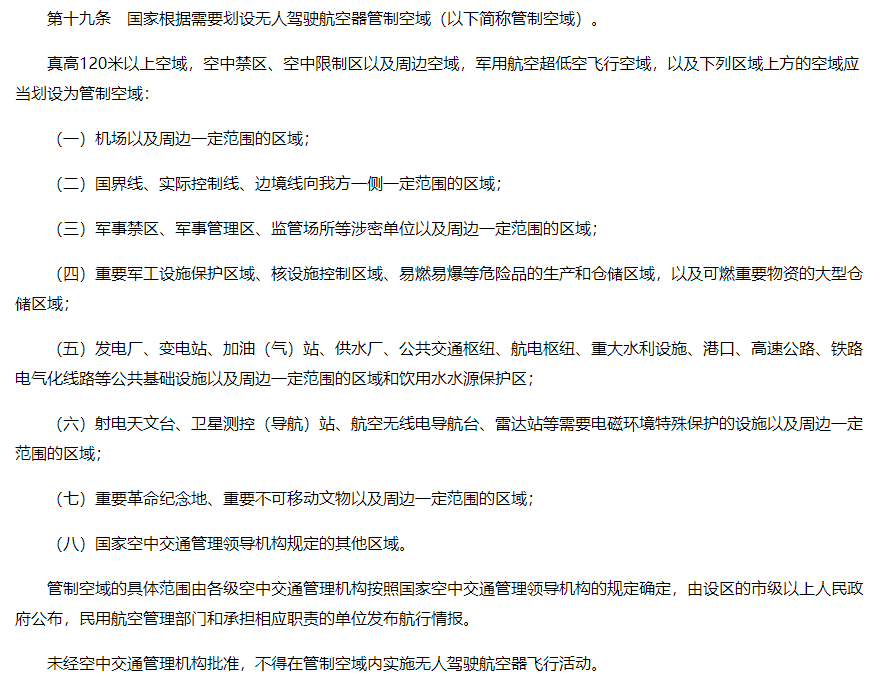 (b)真高120米以上空域,空中禁区、空中危险区以及周边空域,军航超低空飞行空域,以及《无人驾驶航空器飞行管理暂行条例》中确定的管制空域。管制空域范围以外的空域为微型、轻型、小型无人驾驶航空器的适飞空域。