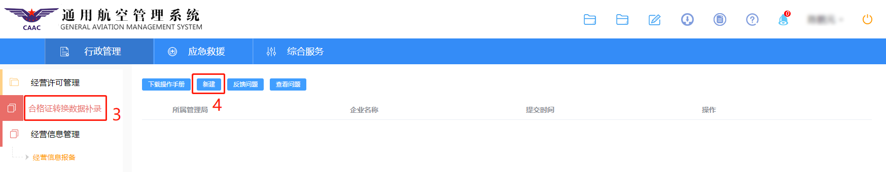 在“行政管理 - 无人机 - 合格证转换数据补录”菜单, 点击“新建”。