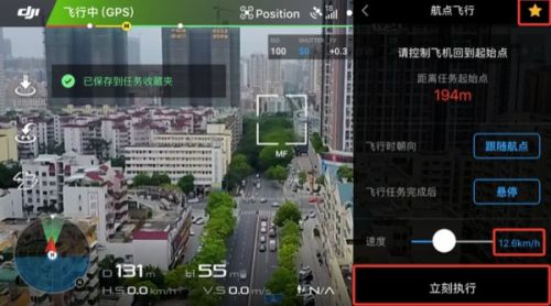 3、点击立即执行,无人机航拍器将自动回到起始位置进行拍摄,即可得到一系列的图片素材。此处应该根据实际情况以及素材的要求,参考上文提到的图片素材数量的计算公式,设置合理的飞行速度。另外值得一提的是,还应该点击界面右上方的收藏按钮,以便此次飞行的航线在天黑后再利用。