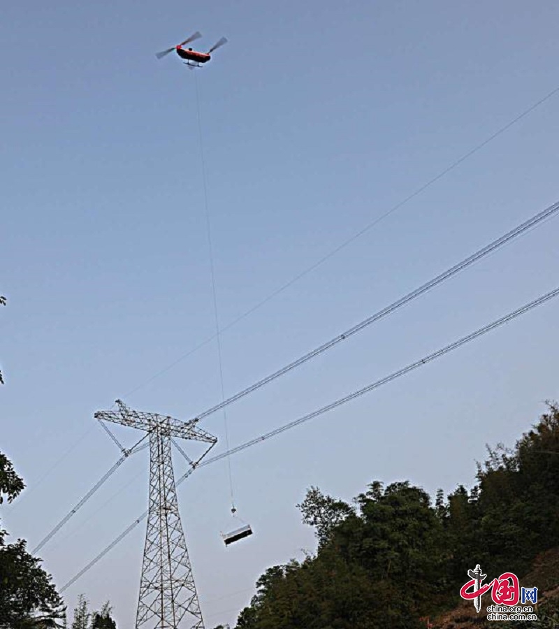 据了解,参与此次作业的无人直升机整机国产率达100%,可挂载200多公斤重物,续航时长为4.5小时,具有安全可靠、机动灵活、不受地形限制等优势,可快速把设备材料送达作业点,节约人力和时间,大幅提升检修效率。“当前风速1米/秒,湿度45%,符合作业条件!”当天14时35分,现场工作负责人王泽昭下达指令开始作业。15分钟后,无人直升机通过悬挂的30米绝缘绳索,搭载设备材料匀速升空,沿既定航线飞至锦苏特高压821号塔物资定置摆放点。