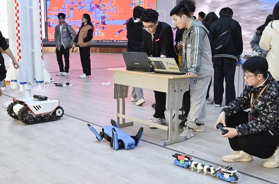 成果展示环节,科技展品琳琅满目,现场演示了编队无人机飞行表演,无人机物料抓取与投放表演,仿生机械狗动作、舞蹈表演,变胞机器人舞蹈表演,蛇形机器人表演,机器人和无人机智能配送,3D 打印、激光切割和激光内雕作品,3D 打印机和光固化打印机作品打印过程打印,履带坦克机器人现场作业等,令现场观摩的大学生拍案叫绝。