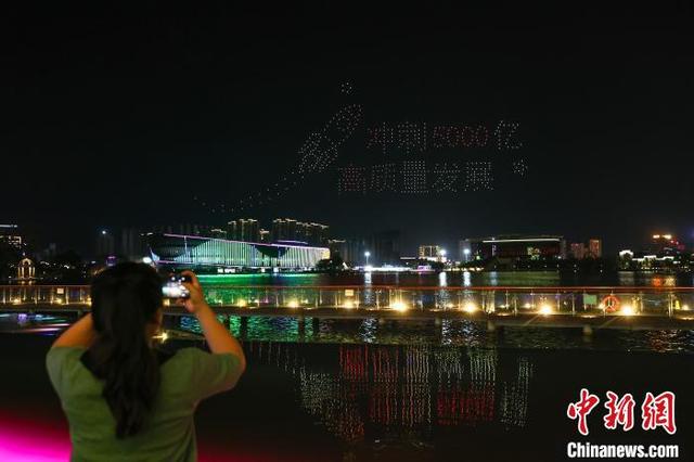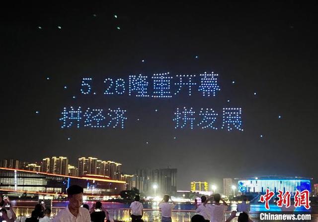 图为无人机编队组成“5.28隆重开幕 拼经济拼发展”字样图案。 陈睿 摄
