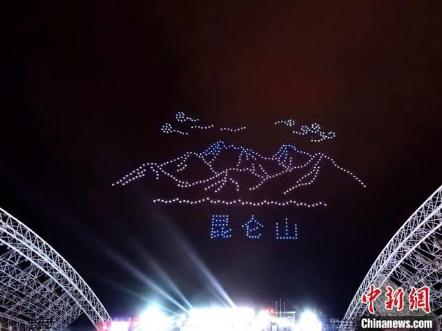 图为无人机在巴音河夜空组成的“昆仑山”图案。赵凛松 摄