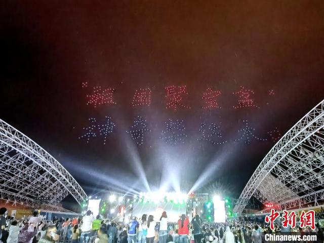 图为来自江苏的500架精密无人机在巴音河夜空组成的“祖国聚宝盆、神奇柴达木”图案。赵凛松 摄