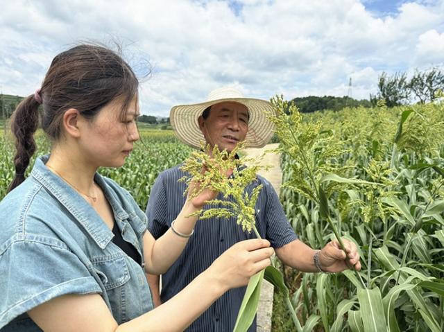 农业服务中心工作人员和高粱种植户查看高粱长势。