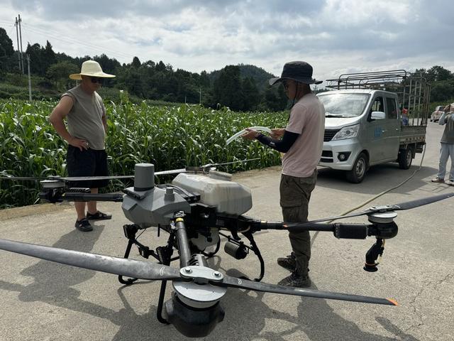 工作人员正在为植保无人机添加农药。