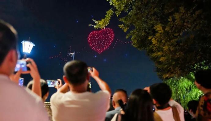 8月10日是七夕节,绍兴古城迎来一年中最“甜”的一天。当天晚,运河畔廊桥上空上演“七夕限定版”无人机表演,百架无人机矩阵点亮星河,再现牛郎织女鹊桥相会的动人传说,现场观众纷纷举起手机记录下这浪漫瞬间。