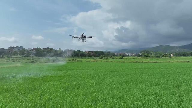 在塔峰镇竹市村的双季稻万亩示范片,连片的稻田郁郁葱葱、生机盎然。两台植保无人机在技术人员操控下,在稻田上低空飞行,均匀将防治药液喷洒在水稻上,短短十几分钟,便完成数亩稻田施药。种植户黄学林告诉记者,这段时间连续的几场秋雨,给稻纵卷叶螟、稻飞虱等病虫的蔓延创造了有利时机,为及时防治水稻病虫害,他请了两台植保无人机来喷施农药,相较于人工喷药,植保无人机更加快捷高效、省时省力,像他种植的400多亩晚稻,只需要一天就可以完成病虫害的防治。