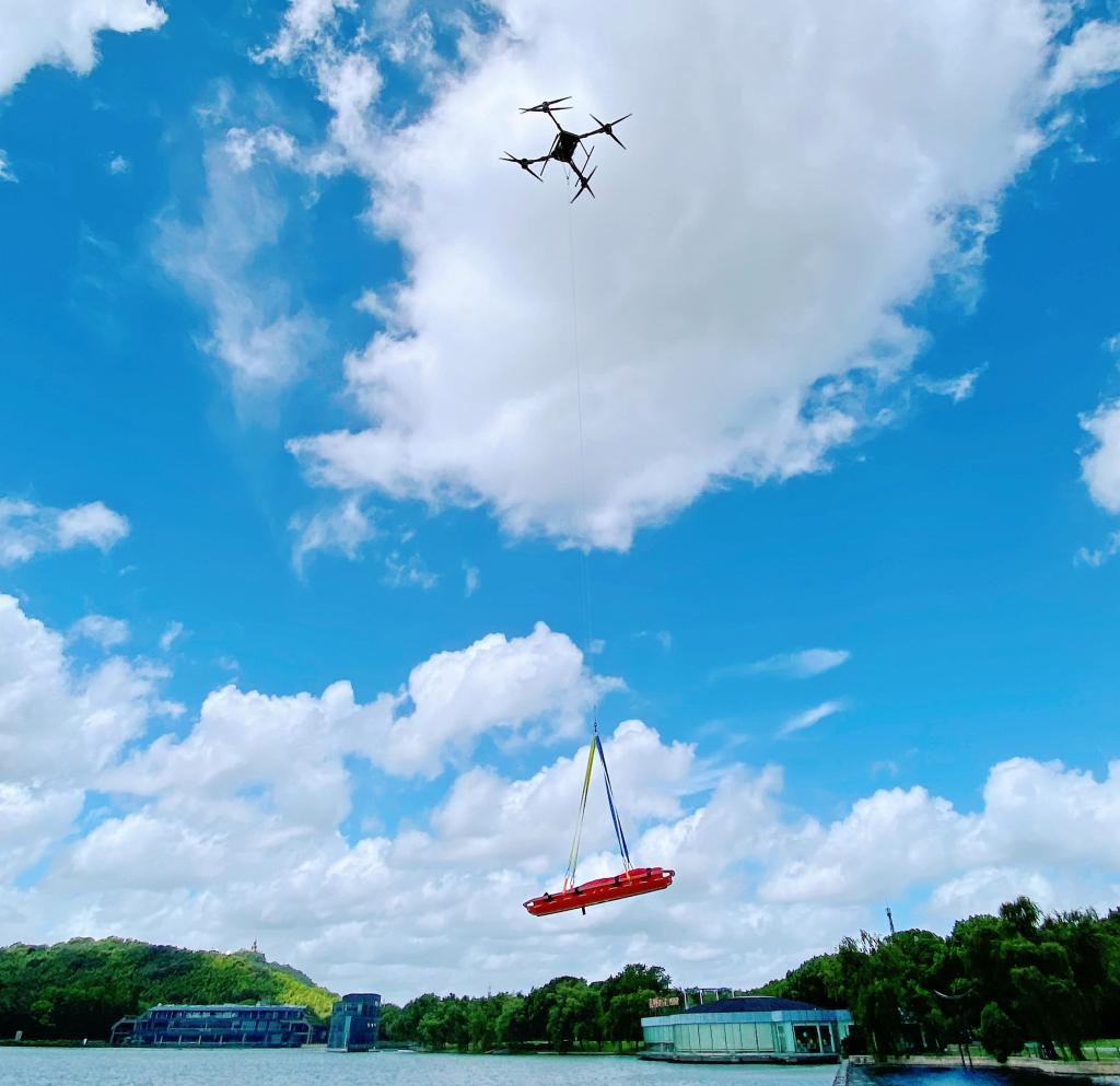 安徽天机翼无人机载重量达到150公斤,可将一副担架提起并进行低空转运。澎湃新闻记者 俞凯 图
