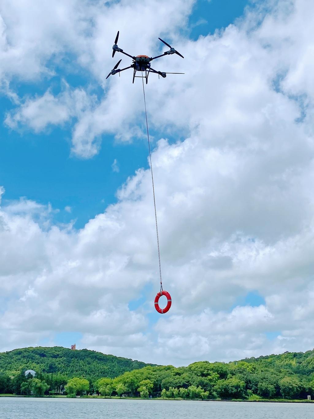 无人机空投救生圈进行水上应急救援。澎湃新闻记者 俞凯 图