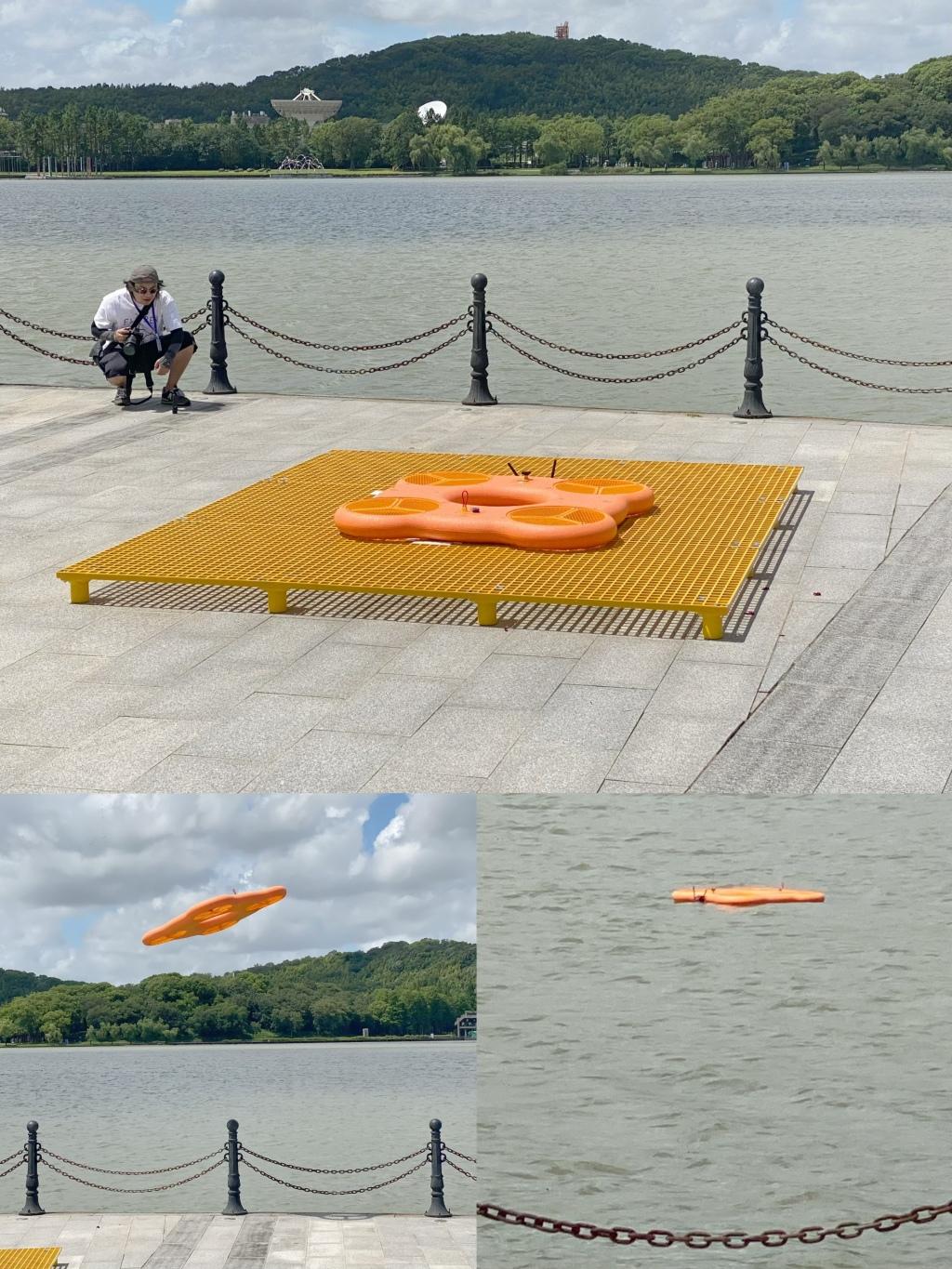 充气垫造型的无人机自主起飞并降落到水面进行施救。澎湃新闻记者 俞凯 图