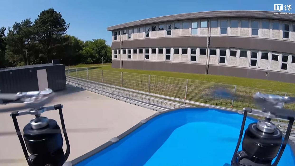 在实战中,这台无人机先从地面起飞,绕建筑飞行一圈后潜入泳池下潜、前进,可在水下潜行、地上飞行间反复切换,全程没有出现卡顿或故障。
