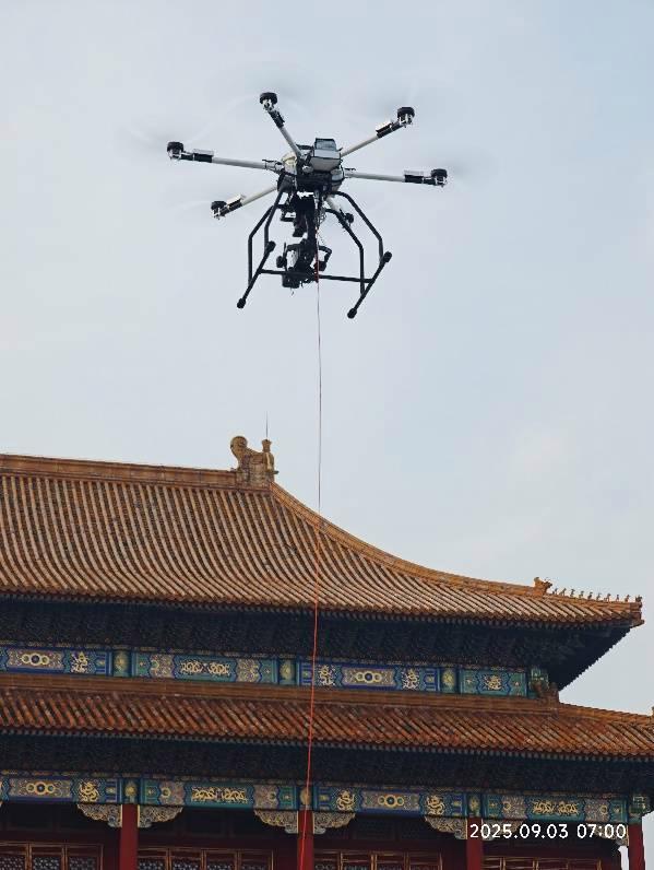 2025年9月3日,北京故宫太和门金水桥前,一架银灰色系留无人机稳稳悬停于150米高空。当纪念中国人民抗日战争暨世界反法西斯战争胜利80周年大会拉开序幕,系留无人机搭载的央视广播级高清摄像机以独特视角定格下这震撼人心的历史瞬间——天安门广场众志成城的激昂高歌,钢铁洪流与千年城垣交相辉映,和平鸽群掠过蓝天划出完美弧线,一幅跨越时空的壮丽画卷通过大工科技的“空中之眼”直播全球。