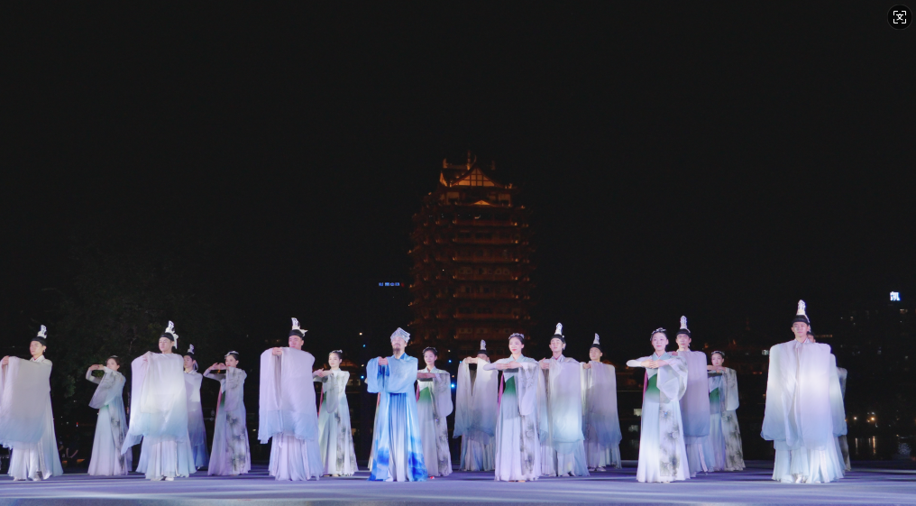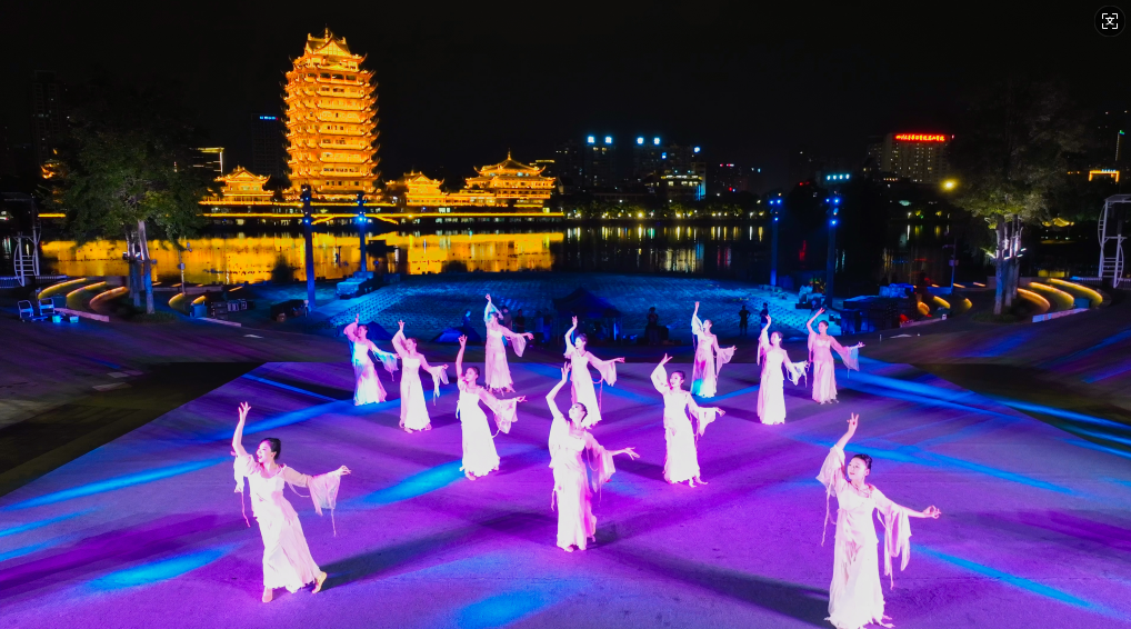 最后,喷泉表演播放《水调歌头》,无人机编队呈现《水调歌头·明月几时有》全文词句字样,观众齐声朗诵,将氛围推向高潮。此时,天空同步出现巨型明月投影,与地面灯光交相辉映。志愿者分发荧光道具,观众手持形成星海。演出终章,音乐喷泉迎来高潮,无人机在远景楼正上方200米处,呈现“东坡故里 天府眉山”的字幕爆闪,同时冷烟花闪亮,生动展现了眉山在传承中不断发展的活力。