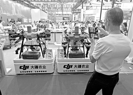 一位参展者在大疆农业无人机前拍照打卡。 安宇飞/摄