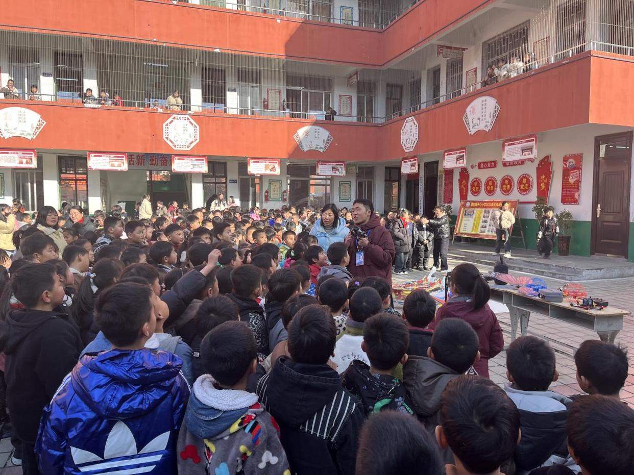 “快看!无人机飞起来了!还能转圈呢,太神奇了!”1月15日,邓州市穰东镇中心小学校园内热闹非凡,欢呼声与惊叹声此起彼伏。邓州市科协组织的“科普大篷车进校园”活动在此拉开帷幕,工作人员携带着多架自主研发的自制无人机走进校园,为孩子们带来了一场集知识讲解、动态展示与实践操作于一体的科技盛宴,让科学的种子在欢声笑语中扎根童心。
