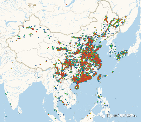 为了更为直观的看到注册于无人机云系统中的无人机运行区域,本报告按季度绘制了无人机运行区域分布图。从图可见,2018年第一季度,注册于云系统的无人机运行范围覆盖了中国、日本,韩国以及东南亚等国家和地区。