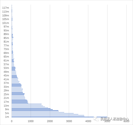通过统计发现,第一季度运行高度在5米(含5米)以下的无人机的飞行小时数占第一季度无人机总飞行小时数的28.67%,运行高度在10米(含10米)以下的无人机的飞行小时数占无人机总飞行小时数的 46.25%,运行高度在15米(含15米)以下的无人机的飞行小时数占到了58.75%。运行高度大于120米的无人机飞行小时数仅占总飞行小时数的7.61%。