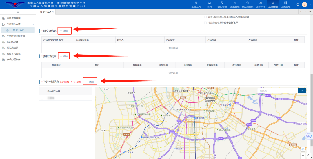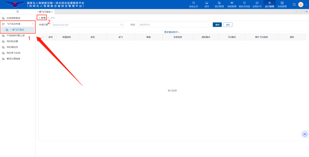 点击“飞行活动申请”-“一般飞行活动”-“新增”,进行相关信息填写。