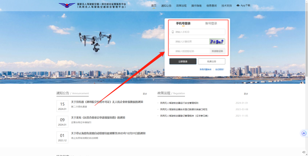打开UOM网站选择“手机号登录”或“账号登录”。(网站链接:https://uom.caac.gov.cn/#/login)