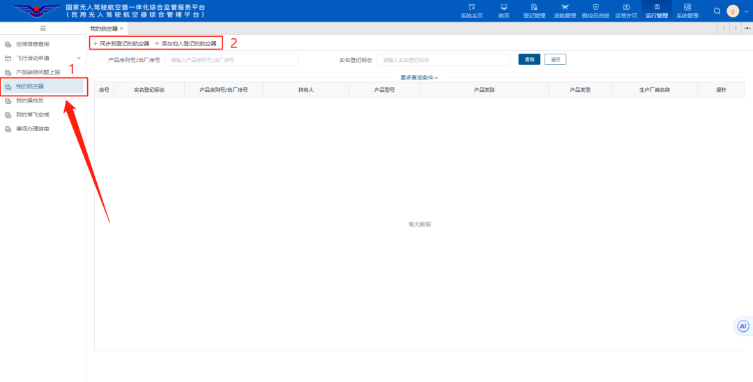 点击“我的航空器”-“同步我登记的航空器”,可同步该账号下所有的航空器。