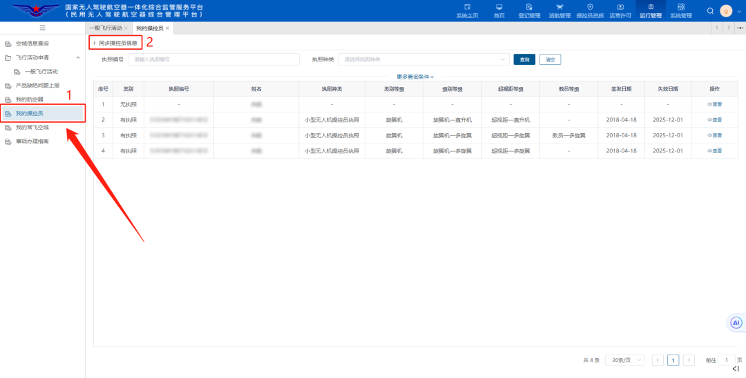 点击“我的操控员”-“同步操控员信息”,系统将自动同步该账号下的所有执照信息。