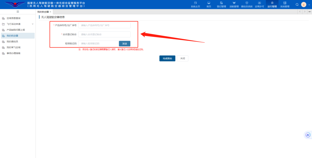 也可选择“添加他人登记的航空器”,进行其他航空器的添加。