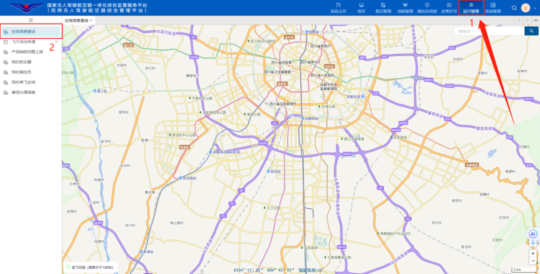 点击“运行管理”-“空域信息查询”,可查看适飞空域。