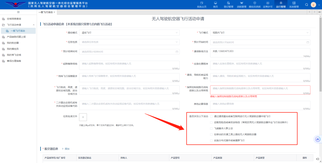 必填项目若无内容则填“无”即可,若飞行过程中涉及下方框选的类型部分,需勾选。