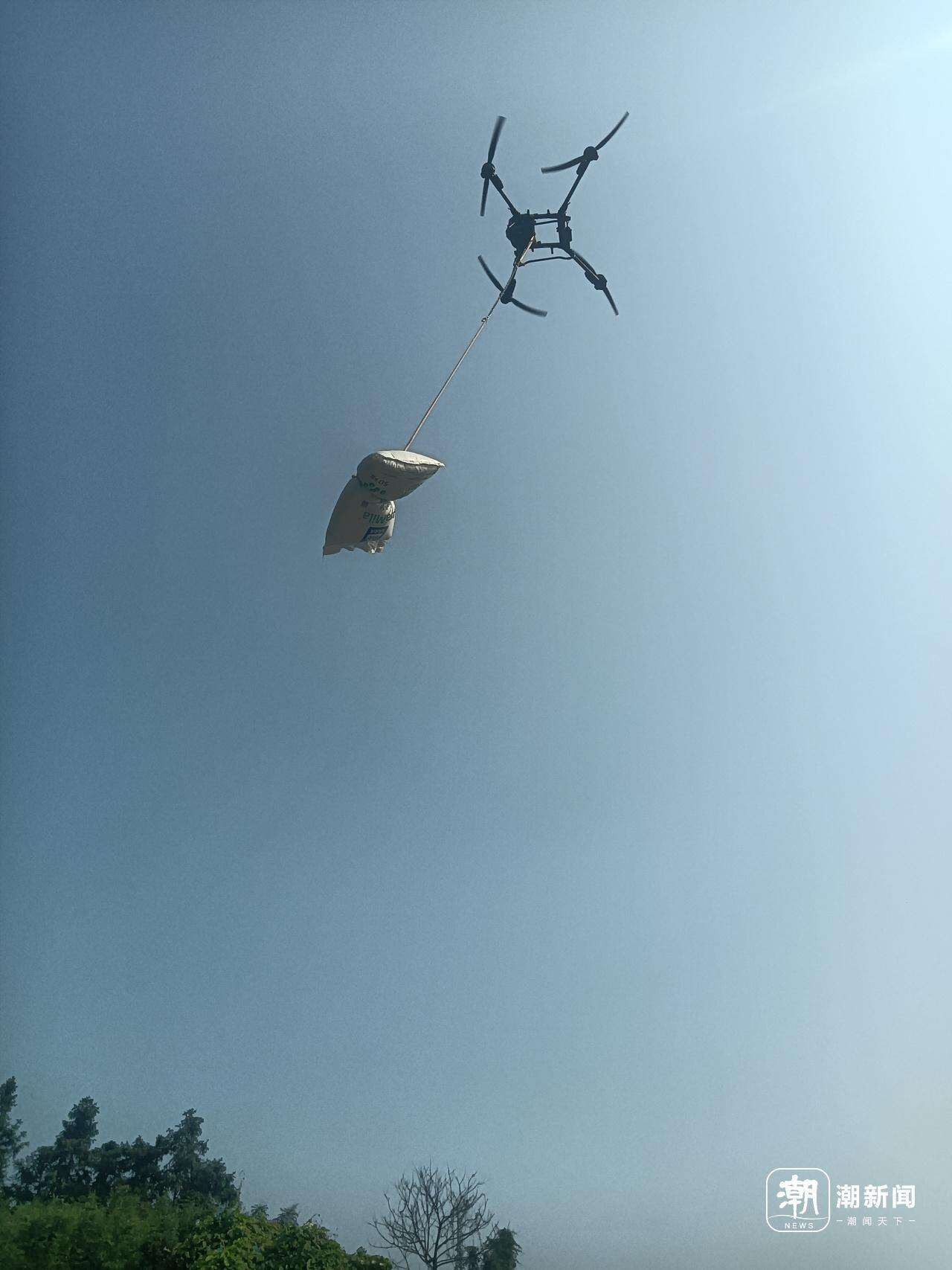 见面地点在里桐坞村的茶山脚下。早上9点多,记者刚到附近,老远就看见一架大型无人机拖着一袋化肥在空中呼啸。无人机来到茶山半山腰的一处位置,卸下肥料后又快速地飞回山脚。