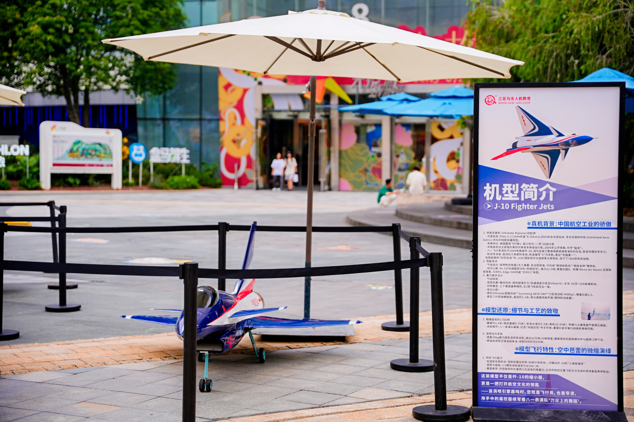 展区C位,三足乌带来的两架高精度复刻航模成为全场焦点。 一架是象征中国航空工业骄傲的 歼-10战斗机模型,其凌厉线条与独特鸭翼布局,吸引众多军事与航空爱好者驻足欣赏、拍照打卡;另一架则是代表极致飞行性能的 Ultimate特技飞机模型,展现了人类挑战天空极限的勇气与技艺。这两架精工细作的航模有效激发了公众特别是青少年对航空历史的兴趣和对飞行原理的探索欲,为后续的互动体验和课程推广营造了浓厚的科技氛围。