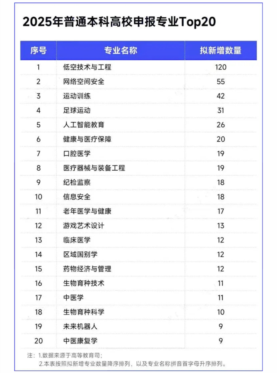 近日,教育部公示的《2025 年度普通高等学校本科专业申报材料》引发关注。此次公示显示,120 所高校计划增设低空技术与工程专业(专业代码:083202TK),该专业成为本次拟增设专业中数量最多的选项。