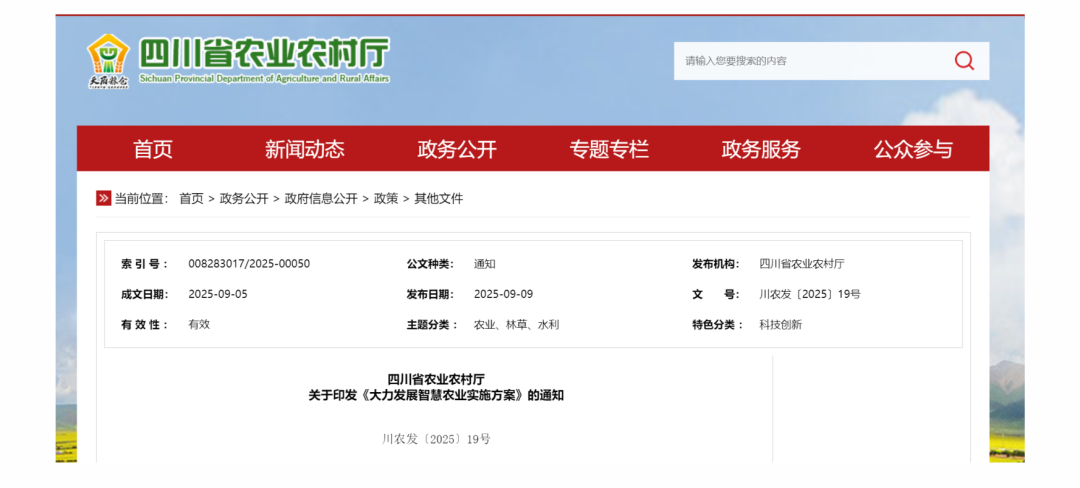 9月9日,四川省农业农村厅发布《大力发展智慧农业实施方案》(川农发〔2025〕19号)及《四川智慧农业行动计划(2025-2028年)》(川农发〔2025〕20号),全面推动智慧农业发展,大力推广农业无人机,培育农业新质生产力。