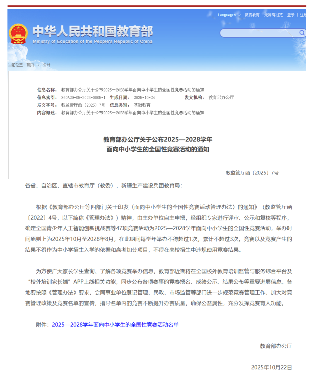 10月22日,教育部办公厅印发教监管厅函〔2025〕7号通知,正式公布《2025—2028学年面向中小学生的全国性竞赛活动名单》(俗称“白名单”),共有全国青少年无人机大赛、全国青少年航天创新大赛、全国青少年模拟飞行锦标赛、“飞向北京·飞向太空”全国青少年航空航天模型教育竞赛活动、全国青少年人工智能创新挑战赛、世界机器人大会青少年机器人设计与信息素养大赛等47项竞赛进入白名单。通知明确,入围竞赛的举办时间原则上为2025年10月至2028年8月,在此期间每学年举办不得超过1次,累计不超过3次。竞赛以及竞赛产生的结果不得作为中小学招生入学的依据和高考加分项目,不得在高校招生中违规使用竞赛结果。