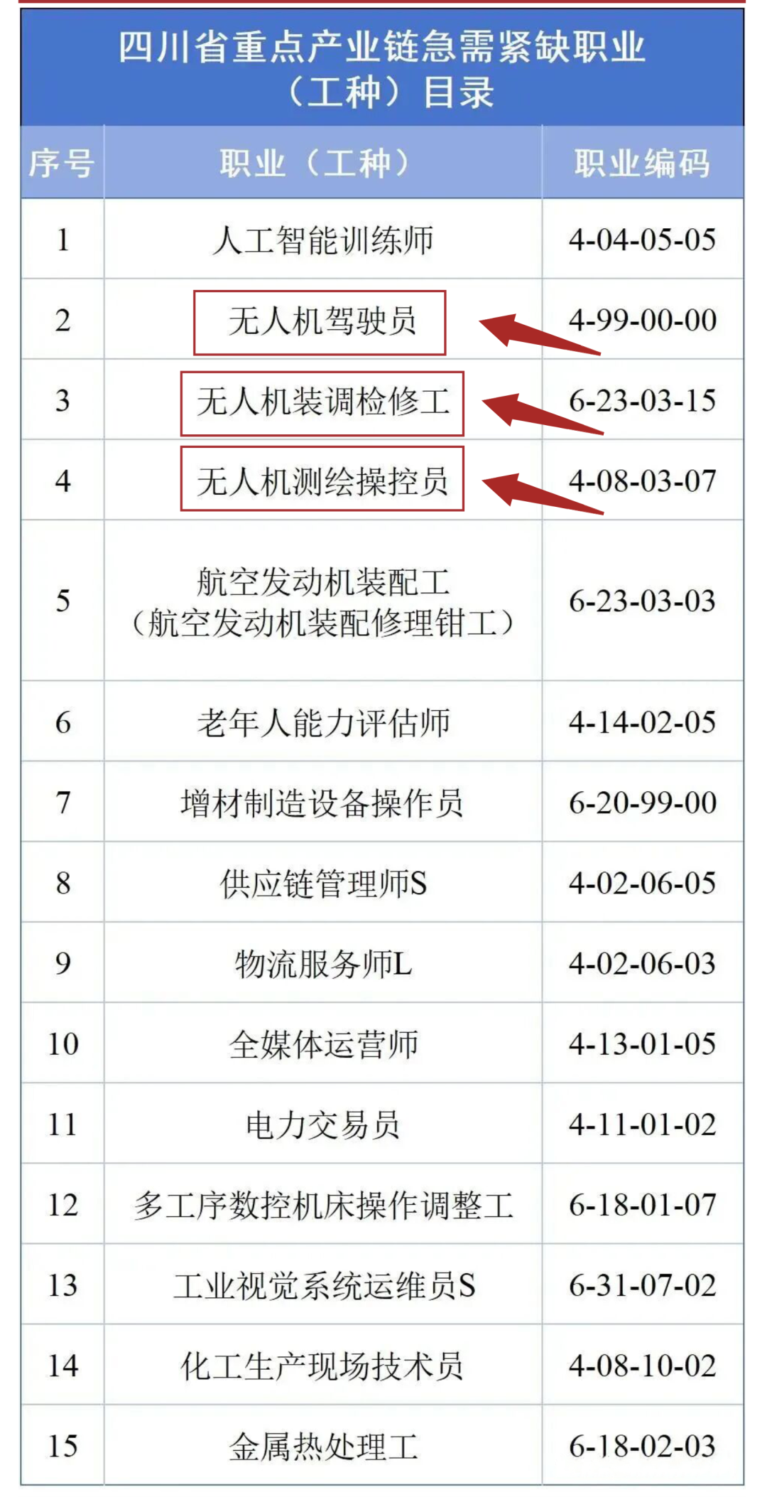 近日,四川省人社厅印发《四川省重点产业链急需紧缺职业(工种)目录》,将无人机驾驶员、无人机装调检修工、无人机测绘操控员、航空发动机装配工 (航空发动机装配修理钳工)、人工智能训练师等列为四川省重点产业链急需紧缺职业(工种)目录。