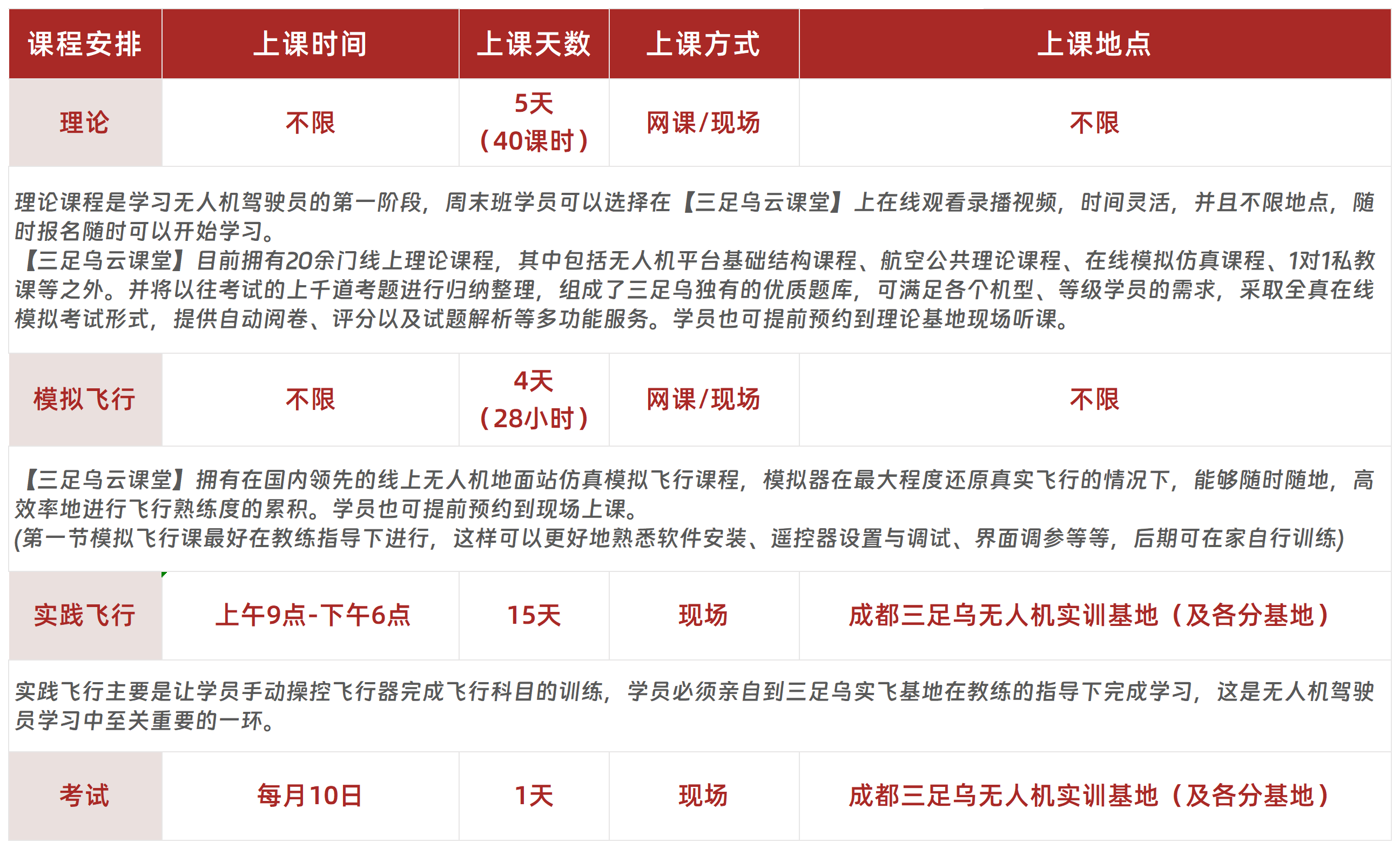 三足乌培训部拥有四川省内各国家重点高校副教授 、教授等职称师资力量,专门针对无人机系统组成、无人机飞行原理与飞行性能、航空气象、空域、无人机起降及巡航阶段操纵技术等进行研究,确保学员在理论考核通过的前提下,学到更多的无人机专业知识;同时三足乌拥有国内少见的由航空模型专业运动队员及教练员组成的无人机实操飞行教学团队,团队成员曾获的国家体育总局颁发的运动健将称号、全国锦标赛冠军等荣誉,并从事无人机行业长达15年以上,具有一流的操作技术及丰富的飞行经验,力争让每一位三足乌的学员都能高效学习、安全飞行。