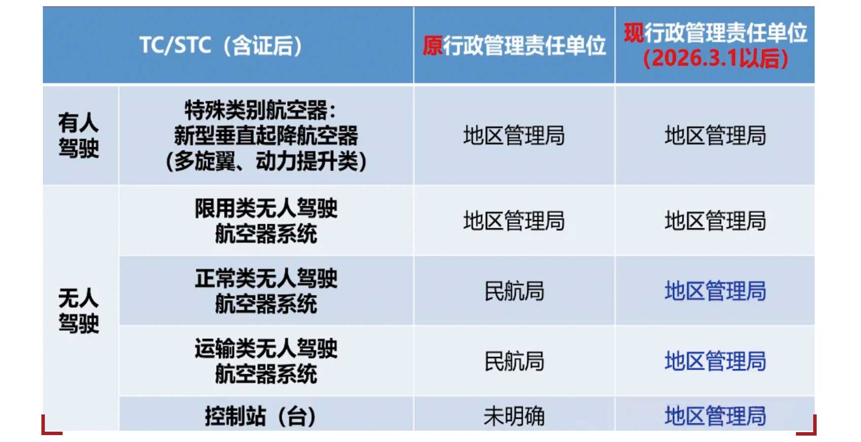 所有类别(限用类、正常类、运输类无人机,有人驾驶eVTOL,遥控台/站)的行政流程,均由地区管理局按属地原则负责。