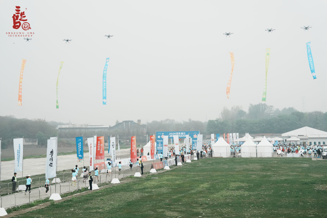 当第一批跑者出现在三足乌飞行营地的视野中时,终点区瞬间沸腾起来。迎接他们的,是6架无人机吊挂着活动主题的竖幅在空中列队欢迎,成为冲线时刻最特别的仪式感。
