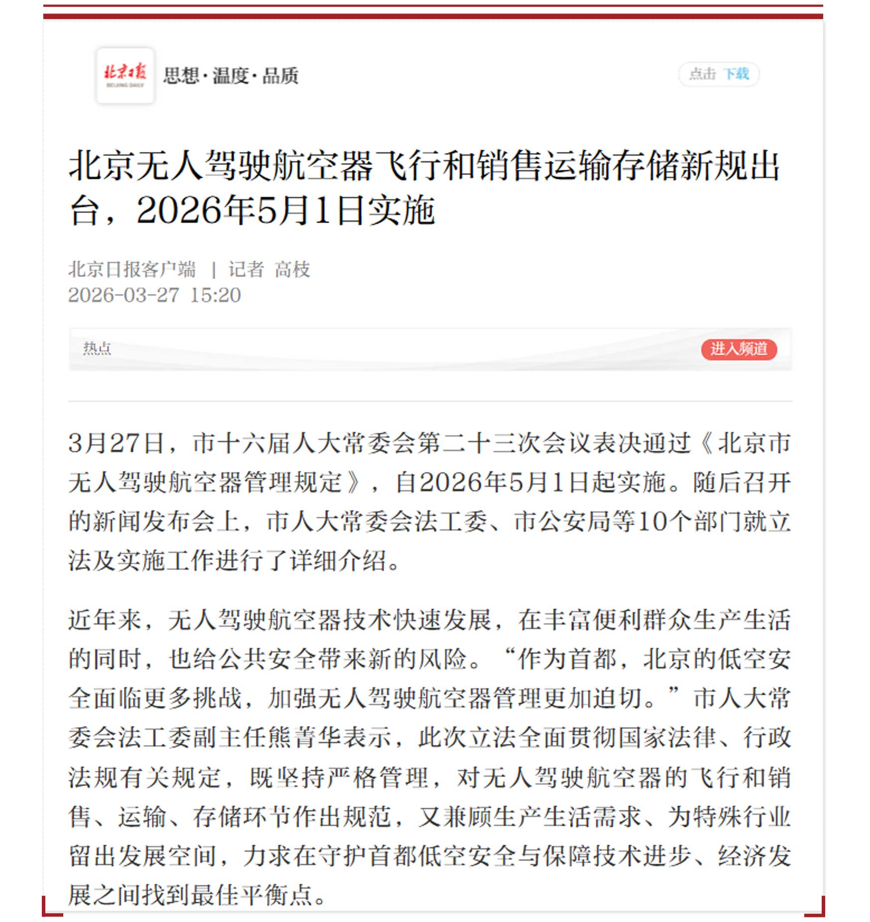 近期,低空经济领域迎来一系列政策利好。应急管理部启动2026年应急管理装备创新揭榜攻关工作,涉及融合飞行安全控制、无人机全自主异地降落等11项任务;《北京市无人驾驶航空器管理规定》获表决通过,将于5月1日起实施;商务部明确深入实施提振消费专项行动,积极拓展低空消费,2026年消博会将推出“游艇+低空”等一批商旅文体健融合特色消费场景。此外,民航局正式颁布《AC332型直升机AEO30分钟功率状态专用条件》,湖北省eVTOL整机研制专项攻关“揭榜挂帅”入围项目也已完成公示。