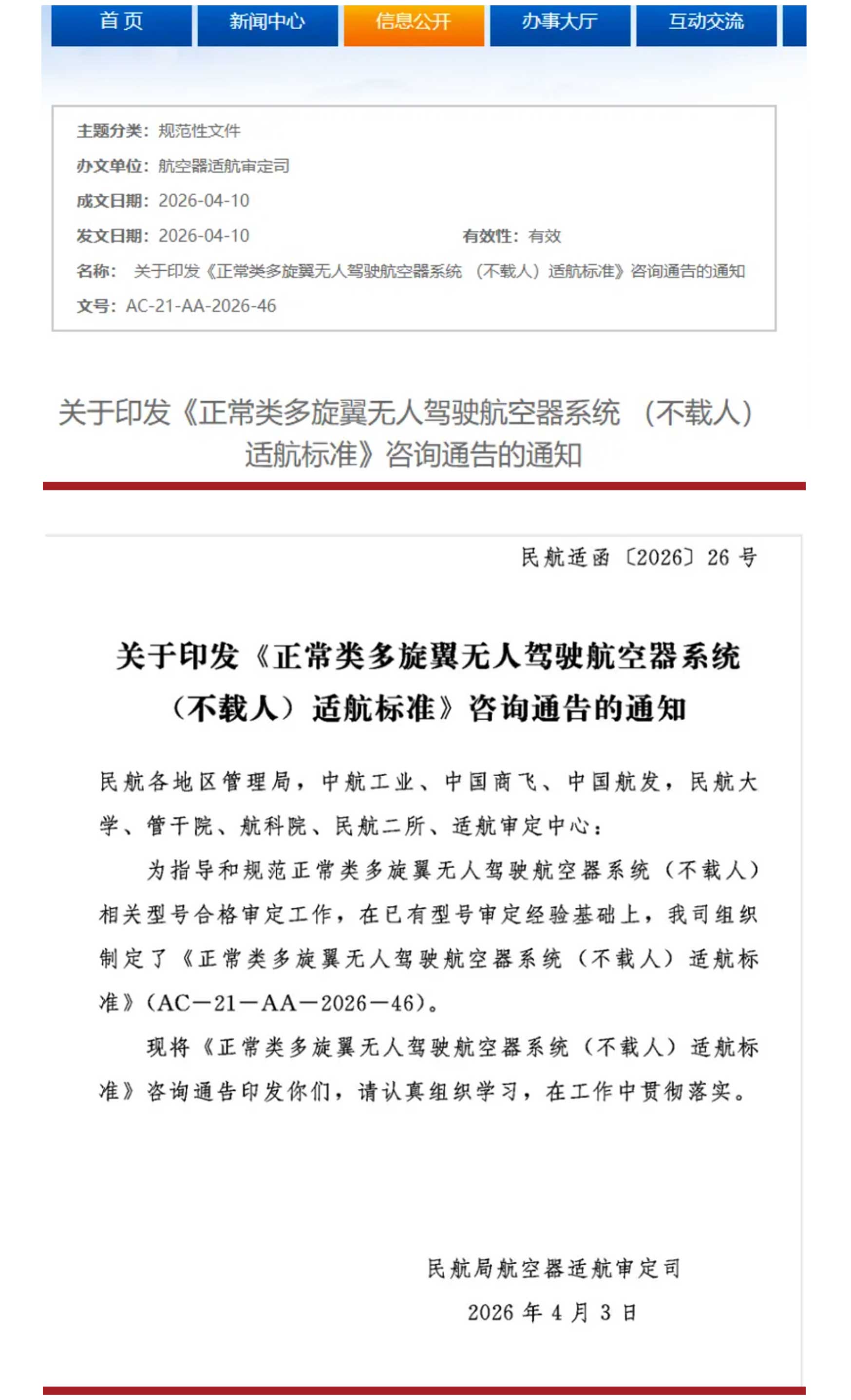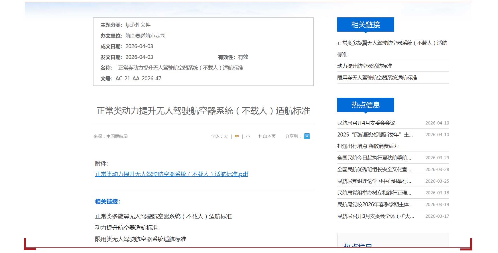近日,中国民用航空局正式发布了两项针对无人驾驶航空器系统的全新适航标准,分别为《正常类多旋翼无人驾驶航空器系统(不载人)适航标准》和《正常类动力提升无人驾驶航空器系统(不载人)适航标准》。两项标准均自2026年4月3日起正式生效。