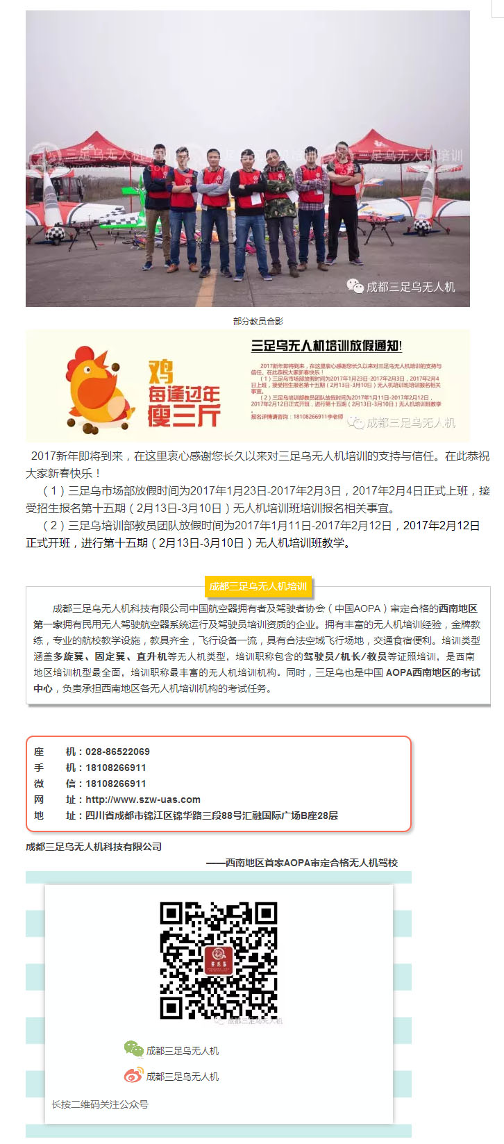 2017年春节三足乌无人机培训放假通知!