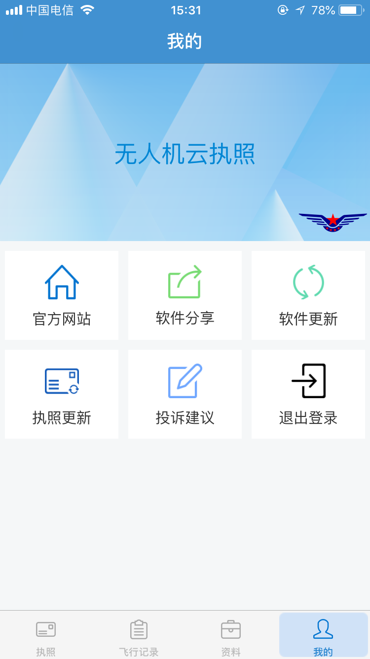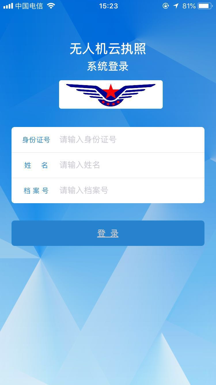 (2)打开【无人机云执照】APP,使用自己的身份证号、姓名、档案号(首次发证日期)登录。